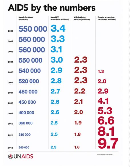 Το 2012, 35,3 εκατομμύρια άνθρωποι σε όλο τον κόσμο –το 70% εκ των οποίων στην υποσαχάρια Αφρική— ζούσαν με τον ιό HIV, 2,3 εκατομμύρια νοσούσαν και 1,6 εκατομμύριο πέθαναν εξαιτίας ασθενειών που σχετίζονται με τον ιό HIV, σύμφωνα με την ετήσια έκθεση του UNAIDS που δημοσιεύθηκε τον Σεπτέμβριο.