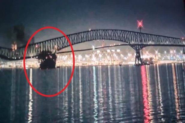 Εντυπωσιακές εικόνες από βίντεο παρακολούθησης δείχνουν ένα πλοίο μεταφοράς εμπορευματοκιβωρίων να προσκρούει σε πυλώνα της γέφυρας Francis Scott Key, με αποτέλεσμα μεγάλο μέρος της μεταλλικής κατασκευής να πέφτει στο ποτάμι.