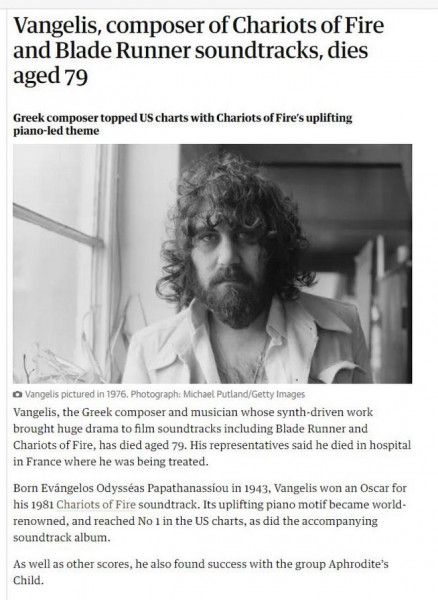 #BREAKING 'Chariots of Fire' and 'Blade Runner' composer Vangelis dies: Greek PM pic.twitter.com/b5Od3uvelf