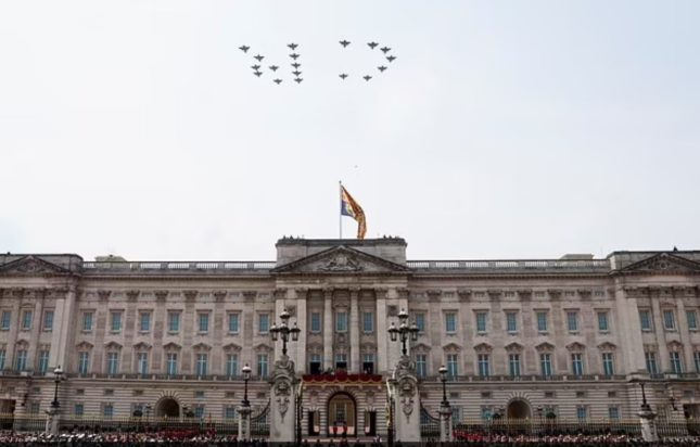 Ο Βασιλιάς Κάρολος, η Κέιτ, ο Ουίλιαμ, η Σάρλοτ, ο Λούις και ο Τζορτζ πήραν τη θέση τους σε μια μάλλον αποδυναμωμένη ως προς τα μέλη της που βγήκαν στο μπαλκόνι, βασιλική οικογένεια, η οποία παρακολούθησε το πέρασμα 70 αεροσκαφών, επάνω από τα ανάκτορα.
