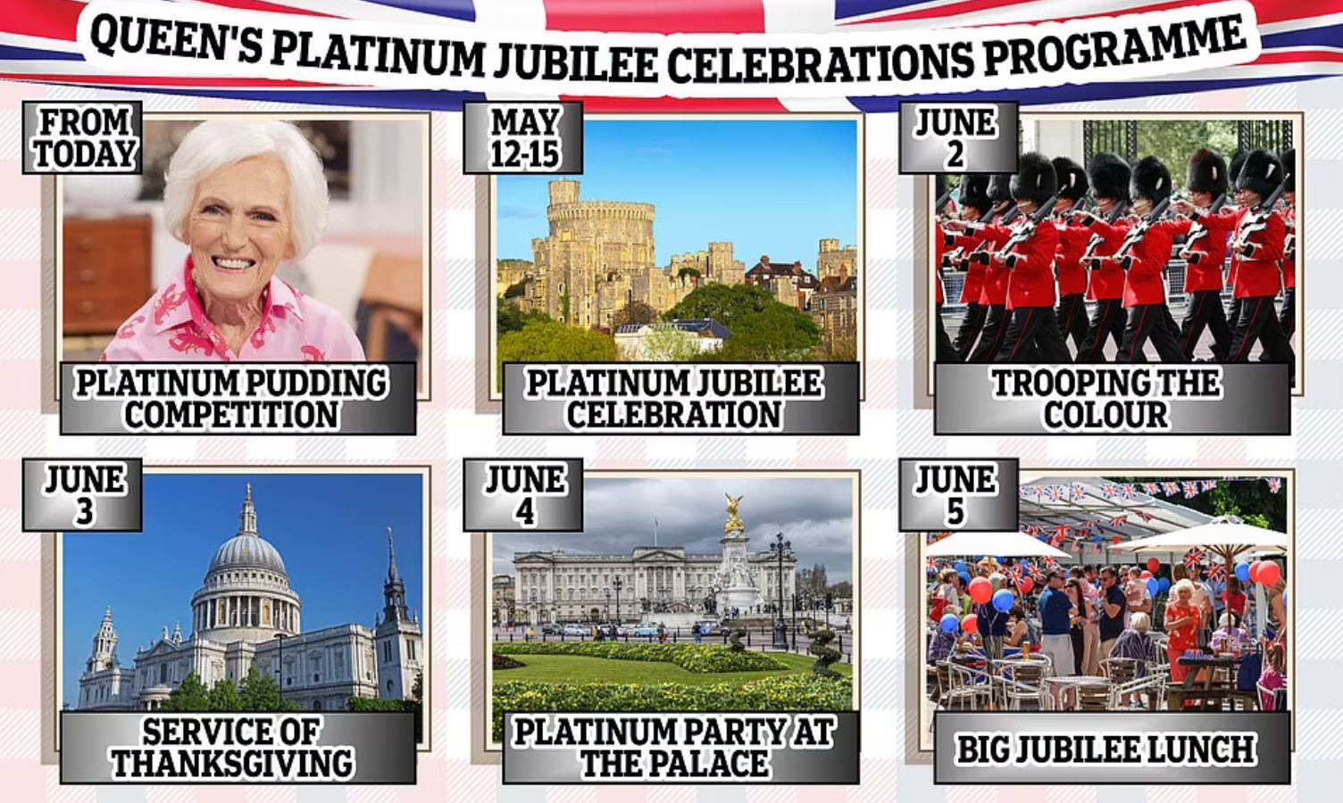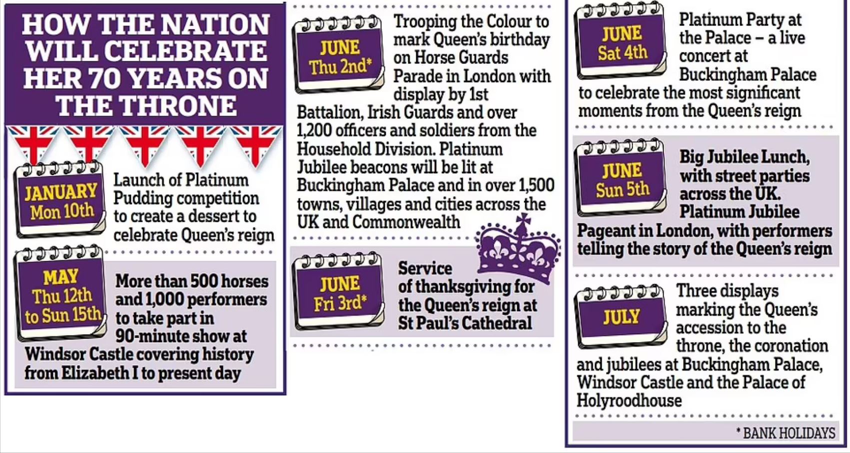 Πάρτι στον δρόμο, συναυλία στην οποία θα εμφανιστούν τα μεγαλύτερα αστέρια της παγκόσμιας μουσικής βιομηχανίας, περιοδεία στις επίσημες κατοικίες της βασίλισσας, όπως και εκθέσεις στα Ανάκτορα, επιδείξεις στο Κάστρο του Ουίνδσορ, διαγωνισμοί και άλλες εκδηλώσεις περιλαμβάνονται στο σχέδιο των Ανακτόρων για τους λαμπερούς εορτασμούς των 70 χρόνων μοναρχίας της Ελισάβετ.