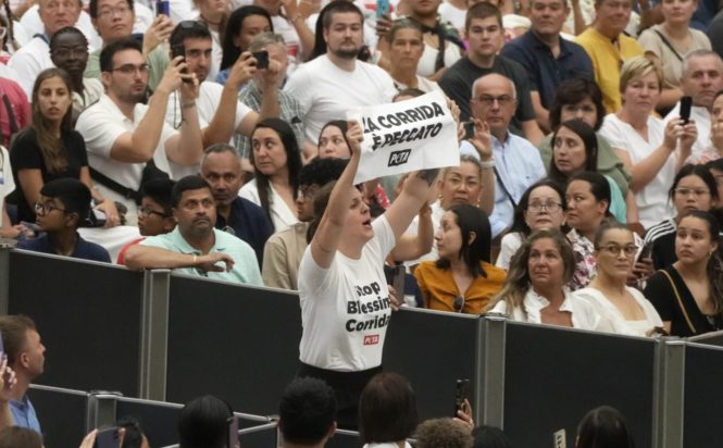 Ενώ ο πάπας Φραγκίσκος χαιρετούσε τους προσκυνητές από διάφορες χώρες του κόσμου, οι δυο ακτιβίστριες της οργάνωσης Peta σήκωσαν πλακάτ τα οποία έγραφαν «η ταυρομαχία είναι αμαρτία». Ταυτοχρόνως φώναξαν το συγκεκριμένο σύνθημα. Φορούσαν μπλουζάκια στα οποία ήταν γραμμένη η φράση «σταματήστε να ευλογείτε τις ταυρομαχίες».