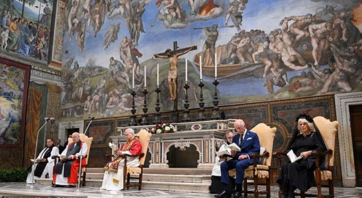 Ο βασιλιάς Κάρολος Γ΄ έγινε σήμερα ο πρώτος Βρετανός μονάρχης που προσευχήθηκε δημόσια με έναν Πάπα, μετά το Αγγλικανικό Σχίσμα τον 16ο αιώνα. Η κοινή προσευχή έλαβε χώρα στo Βατικανό, στη διάρκεια οικουμενικής λειτουργίας, της οποίας χοροστάτησε ο πάπας Λέων ΙΔ’, στην Καπέλα Σιξτίνα.