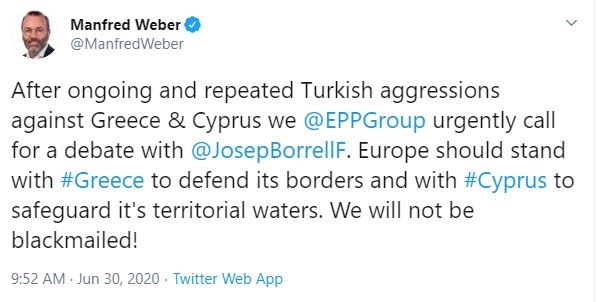 Ο επικεφαλής του Ευρωπαϊκού Λαϊκού Κόμματος στο Ευρωπαϊκό Κοινοβούλιο, Μάνφρεντ Βέμπερ αναφέρθηκε στις τουρκικές προκλήσεις εναντίον της Ελλάδας και της Κύπρου με ανάρτηση που έκανε στον προσωπικό του λογαριασμό στο Twitter.