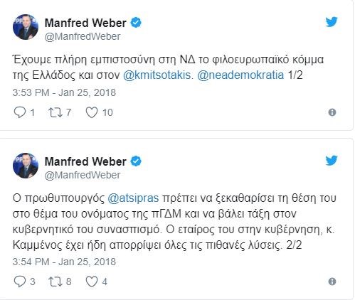 Μάλιστα, οι αναρτήσεις του κ. Βέμπερ ήταν στα ελληνικά με την πρώτη να αναφέρει ότι «Έχουμε πλήρη εμπιστοσύνη στη ΝΔ το φιλοευρωπαϊκό κόμμα της Ελλάδος και στον Κυριάκο Μητσοτάκη» και στη δεύτερη να συμπληρώνει: «Ο πρωθυπουργός Αλέξης Τσίπρας πρέπει να ξεκαθαρίσει τη θέση του στο θέμα του ονόματος της πΓΔΜ και να βάλει τάξη στον κυβερνητικό του συνασπισμό. Ο εταίρος του στην κυβέρνηση, κ. Καμμένος έχει ήδη απορρίψει όλες τις πιθανές λύσεις». Δείτε τις αναρτήσεις του Βέμπερ: