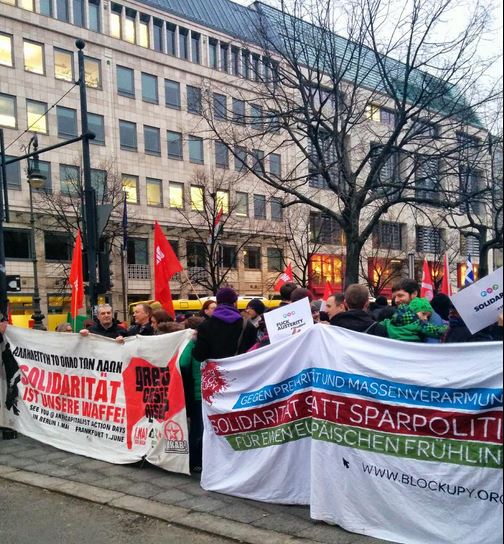 Οι διαδηλωτές κρατούν πανό κατά της λιτότητας με σύνθημα “Αλληλεγγύη – Το όπλο των λαών”.