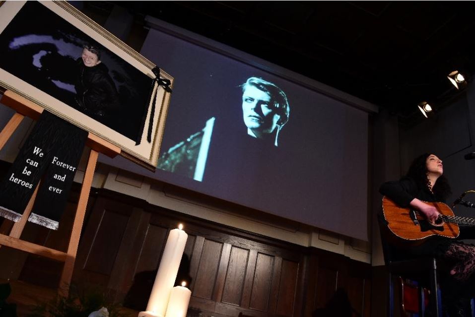 Στην μεγάλη αίθουσα επικρατούσε συνωστισμός, ενώ δέσποζε η φωτογραφία του Μπάουι να χαμογελά μπροστά από την οποία είχαν τοποθετηθεί κεριά. Σε δύο μαύρες κορδέλες αναγραφόταν η φράση «Μπορούμε να είμαστε ήρωες. Για πάντα», που παρέπεμπε στους στίχους του μυθικού άλμπουμ «Heroes», που ηχογραφήθηκε το 1977 σε αυτό το στούντιο.