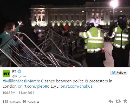 Ένταση επικράτησε το βράδυ της Τετάρτης στους κεντρικούς δρόμους του Λονδίνου όταν διαδηλωτές, η πλειονότητα των οποίων φορούσε μάσκες, όπως αυτή του Γκάι Φοκς από το μυθιστόρημα V for Vendetta, συγκρούστηκαν με την αστυνομία.