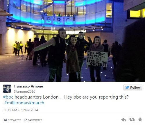Στη συνέχεια διαδηλωτές έφτασαν μέχρι τα κεντρικά γραφεία του BBC έξω από τα οποία φώναζαν «ντροπή σου BBC».