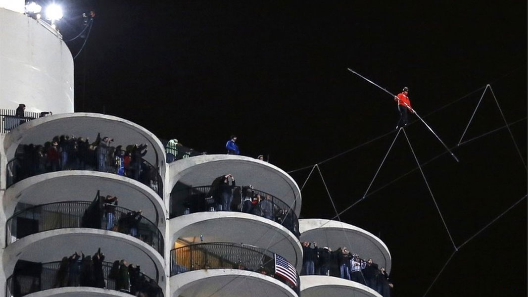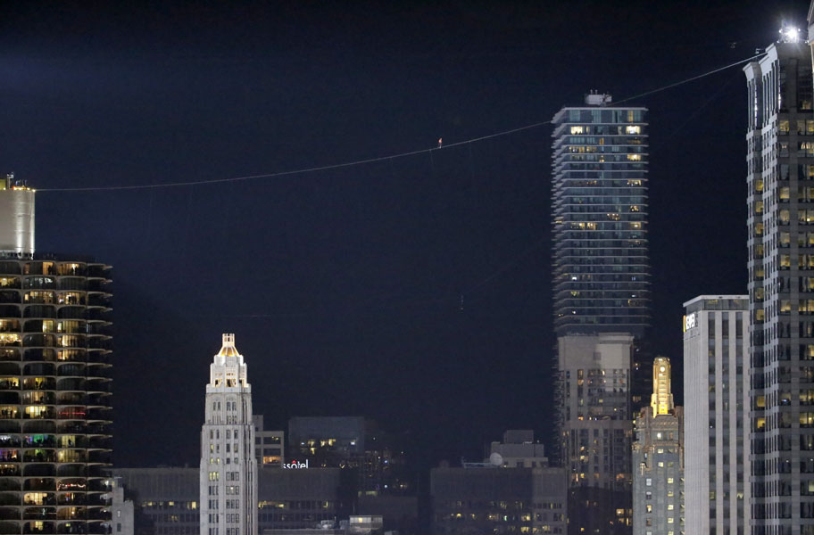 Ο διάσημος ακροβάτης, γόνος μίας οικογένειας που ασχολείται με το αντικείμενο αυτό επί επτά γενιές, κατόρθωσε να περάσει πάνω από τον ποταμό της πόλης, από την κορυφή του πρώτου ουρανοξύστη ως τον πρώτο από τους δύο πύργους του Marina City.