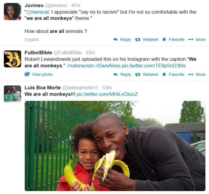 Το επεισόδιο με τον Ντάνι Άλβες έβαλε “φωτιά” στα social, όπως προαναφέρθηκε. Αμέσως δημιουργήθηκε το Hashtag “we are all monkeys” και όπως φαίνεται στις φωτογραφίες παρακάτω, η κατακραυγή είναι παγκόσμια και έντονη.