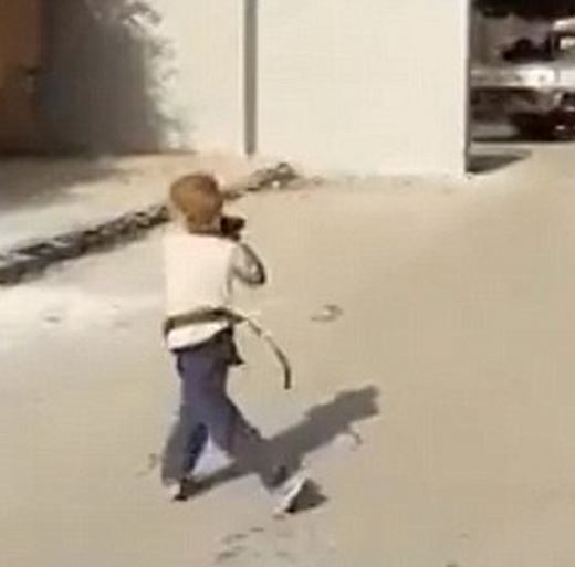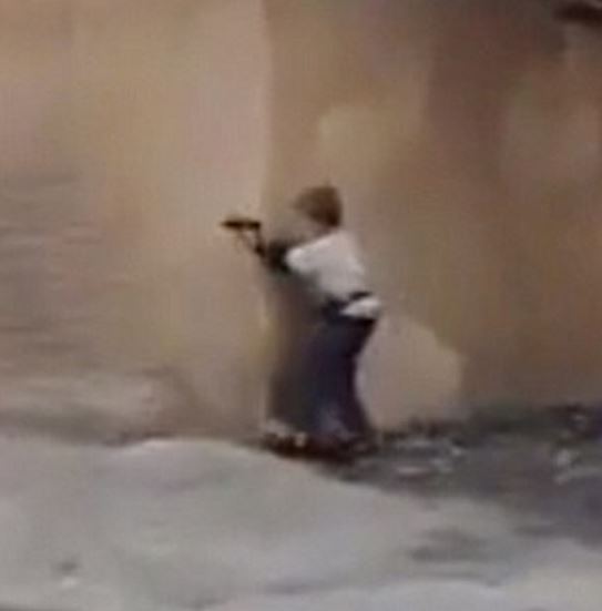 Το μικρό αγόρι έχει βιντεοσκοπηθεί να τρέχει από γωνιά σε γωνιά με όπλο στο χέρι, προσποιούμενο ότι εμπλέκεται σε ανταλλαγή πυρών.