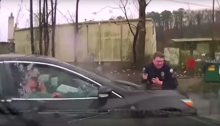 Ο αστυνομικός πυροβολάει πέντε φορές πριν βρεθεί στο παμπρίζ του αυτοκινήτου, που συνεχίζει να κινείται αργά.