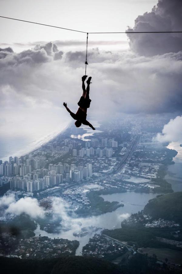 Αυτά τα κάνουν λίγοι. Όπως ο Brian Mosbaugh, που περπάτησε πάνω σε τεντωμένο σχοινί, σε μια απόσταση 100 μέτρων από τη μία κορυφή του βράχου στην άλλη. Στο Ρίο ντε Τζανέιρο, στο σημείο Pedra da Gavea Highline, 850 μέτρα πάνω από τη μεγαλούπολη!