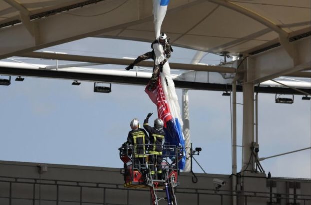 Το βίντεο δείχνει τη στιγμή που ένας αλεξιπτωτιστής πιάστηκε στην οροφή ενός σταδίου πριν από έναν αγώνα ράγκμπι στη Γαλλία.