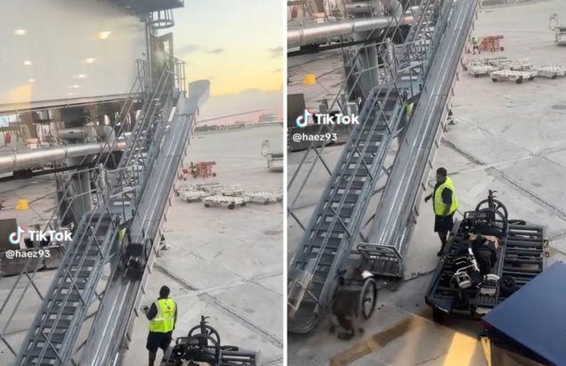 Στο βίντεο που δημοσιεύτηκε αρχικά στο TikTok στις 19 Νοεμβρίου , ένα μέλος του προσωπικού της American Airlines φαίνεται να αφήνει ένα αναπηρικό καροτσάκι στην κορυφή του ιμάντα αποσκευών καθώς άλλος υπάλληλος περιμένει στο κάτω μέρος.