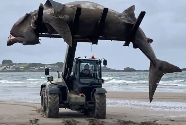 Ένας καρχαρίας 7,5 μέτρων ξεβράστηκε σε μια παραλία του Ηνωμένου Βασιλείου το Σαββατοκύριακο και χρειάστηκε ένα περονοφόρο ανυψωτικό για να ανασύρει το τεράστιο θηρίο από την ακτή, δείχνουν οι φωτογραφίες.