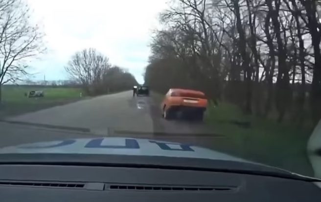 Το υλικό δείχνει το πορτοκαλί όχημα να σταματά στην άκρη του δρόμου, ενώ ένας αστυνομικός πλησιάζει τρέχοντας.