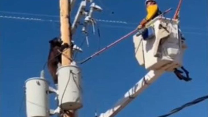 Ο τεχνικός διέκοψε την παροχή ρεύματος και ανέβηκε με γερανοφόρο όχημα για να ενθαρρύνει το ζώο να κατέβει με ασφάλεια.