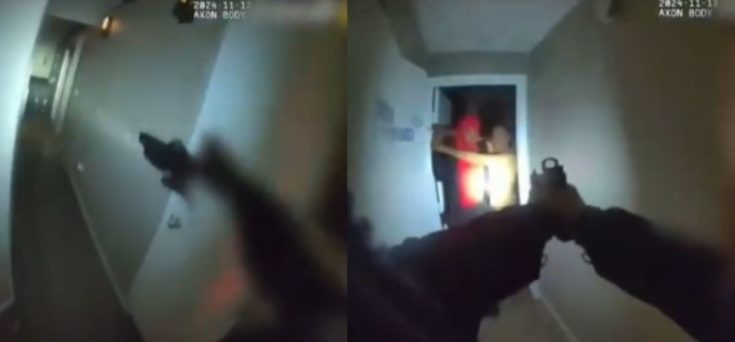 Ο 43χρονος βρισκόταν στο σπίτι του και πάλευε με μία 31χρονη που είχε κάνει διάρρηξη και κρατούσε μαχαίρι. Στο βίντεο φαίνεται ο 26χρονος αστυνομικός να φτάνει στην είσοδο ενός δωματίου και εκεί να βλέπει δύο άτομα, ένα με τα εσώρουχα και ένα με κόκκινη κουκούλα να παλεύουν με ένα μαχαίρι.