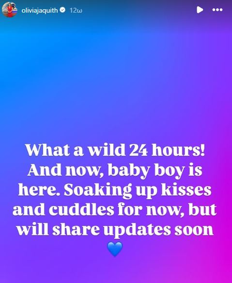Την επόμενη ημέρα, η Olivia Jaquith ανακοίνωσε τη γέννηση του γιου της – του πρώτου της παιδιού με τον σύζυγό της. «Τι τρελές 24 ώρες! Και τώρα, το αγοράκι είναι εδώ», έγραψε στο Instagram. «Απολαμβάνουμε φιλιά και αγκαλιές προς το παρόν, αλλά θα μοιραστώ νέα σύντομα».