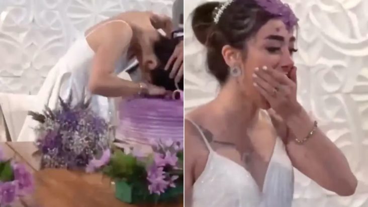 Το viral βίντεο δείχνει έναν άνδρα –του οποίου η ταυτότητα παραμένει άγνωστη– να σπρώχνει το κεφάλι της νύφης μέσα στην τούρτα του γάμου, με το μωβ γλάσο να καλύπτει ολόκληρο το πρόσωπό της.