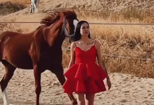 Η γυναίκα, ξυπόλητη αλλά φορώντας ένα κομψό κόκκινο φόρεμα, περπάτησε με σιγουριά ανάμεσα στα άλογα καθώς έτρεχαν δίπλα της πριν υποστεί μια βάναυση ατυχία.