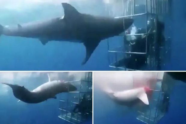 Ένας μεγάλος λευκός καρχαρίας που προσπαθούσε να μπει στο κλουβί που ήταν μέσα δύο δύτες, χτυπήθηκε τόσο δυνατά στις ράβδους που έσπασε το λαιμό του και παρασύρθηκε νεκρός στον βυθό του ωκεανού, δείχνει το βίντεο.