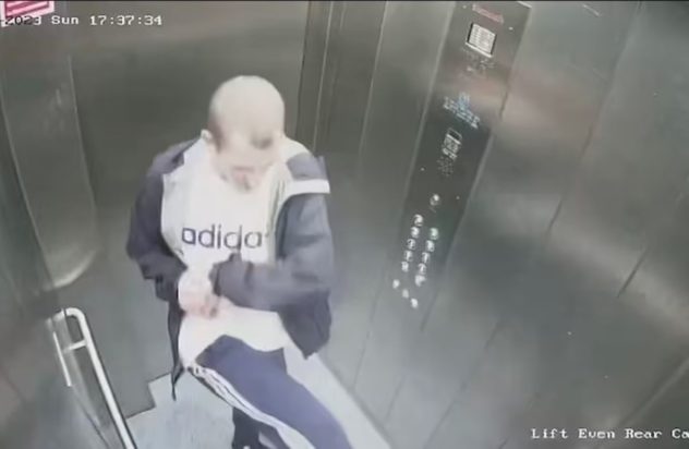 Το βίντεο δείχνει τον 22χρονο να κλωτσάει το σκυλί καθώς αυτό κρύβεται στη γωνία του ανελκυστήρα. Πατάει επίσης το κεφάλι του με το πόδι και αρχίζει να του φωνάζει χωρίς προφανή λόγο.
