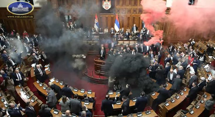🟡 NOW: Smoke bombs in the Serbian parliament. Chaos breaks out as opposition politicians protest against the parliamentary session in support of the massive anti-government student protests that are gripping the country. pic.twitter.com/BbgcO8uIVS