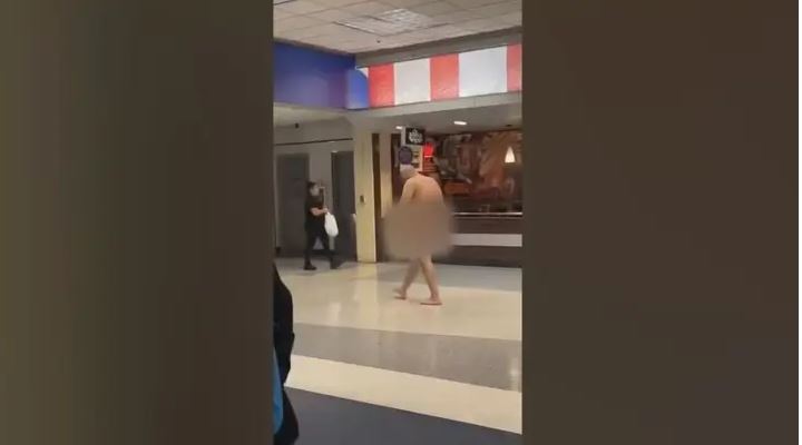 Το βίντεο που τράβηξε τα βλέμματα δείχνει τον άνδρα – χωρίς αποσκευές, παπούτσια ή ρούχα – να περνά αργά από ένα κατάστημα εστίασης γύρω στις 22:15 μέσα στο Terminal C του αεροδρομίου, το οποίο εκτελεί αποκλειστικά πτήσεις της American Airlines.