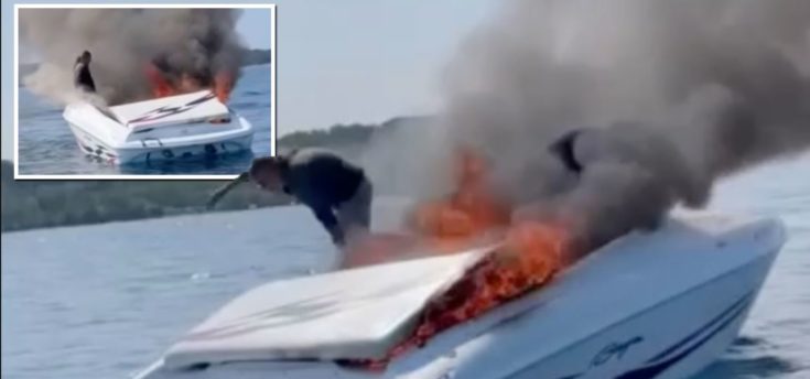 Οι άγνωστοι βαρκάρηδες εμφανίζονται να αγωνίζονται να ελέγξουν την κατάσταση ανάμεσα στις αυξανόμενες φλόγες και τον πυκνό μαύρο καπνό. Το περιστατικό έγινε την Παρασκευή στον κόλπο West Grand Traverse στο Μίσιγκαν.