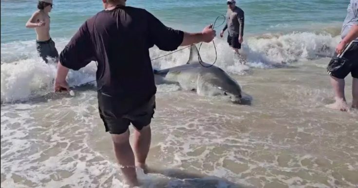 Ο τεράστιος λευκός καρχαρίας βγήκε στην ακτή. Εκεί οι ψαράδες πάλευαν επί 35 λεπτά για να τον βοηθήσουν να επιστρέψει στον ωκεανό.