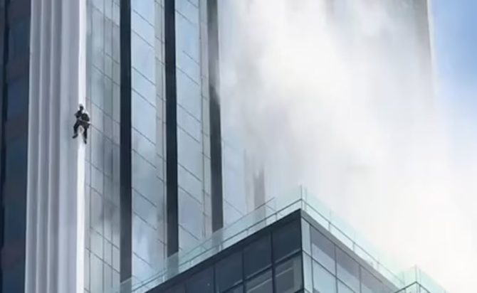 Η στιγμή που ένας καθαριστής τζαμιών στην Ταϊλάνδη κρέμεται από ουρανοξύστη με σχοινί και προσπαθεί να σωθεί κατά την διάρκεια του σεισμού των 7,7 Ρίχτερ στην Μιανμάρ έχει καταγραφεί σε βίντεο.