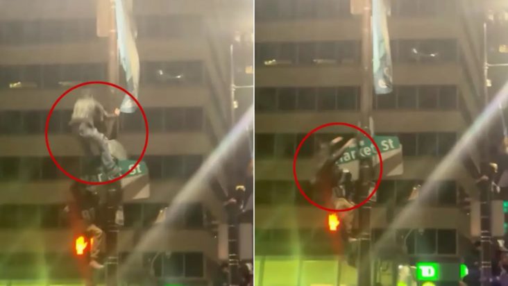 INSANE FOOTAGE 😳: Eagles fan. Falls on his head after climbing street sign. pic.twitter.com/pA6f4x07gI
