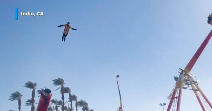 Ο Τσάτσι Βαλένθια, γνωστός ως The Rocketman Valencia, εκτελούσε το εντυπωσιακό του νούμερο στο Riverside County Fair and National Date Festival στην Ιντίο της Καλιφόρνια στις 2 Μαρτίου, όταν μια ισχυρή ριπή ανέμου τον έσπρωξε μακριά από το προκαθορισμένο σημείο προσγείωσης.