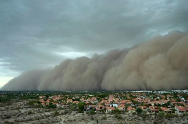Μια τεράστια αμμοθύελλα σάρωσε περιοχές της πολιτείας της Αριζόνα στις ΗΠΑ. Το παχύ τείχος από σκούρα σκόνη στην κομητεία Πινάλ παρασύρθηκε από τους καταιγιδοφόρους ανέμους – ένα φαινόμενο γνωστό ως χαμπούμπ, σύμφωνα με την Εθνική Μετεωρολογική Υπηρεσία.