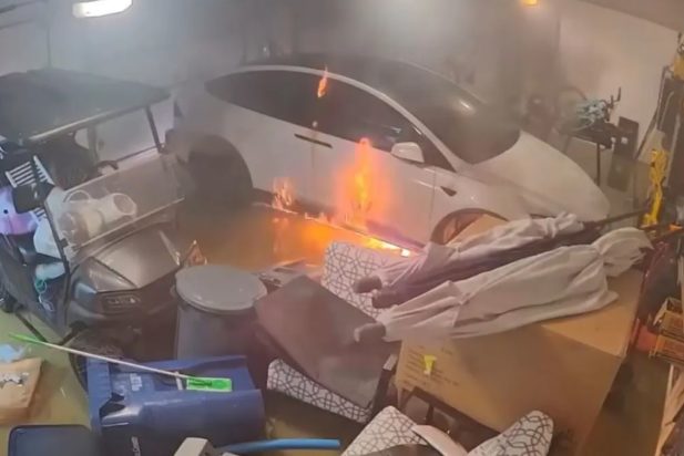 Η φωτιά ξεκίνησε κάτω από το αυτοκίνητο και το έκαψε ολοσχερώς σε λιγότερο από ένα λεπτό, σύμφωνα με πλάνα παρακολούθησης από το ακατάστατο γκαράζ όπου πυκνός καπνός γέμισε γρήγορα το δωμάτιο.