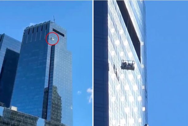 Η σκαλωσιά χτυπούσε στο πλάι του κτιρίου και προκάλεσε τη θραύση ενός παραθύρου στον 78ο όροφο, με αποτέλεσμα τα γυαλιά να πέσουν στον δρόμο.
