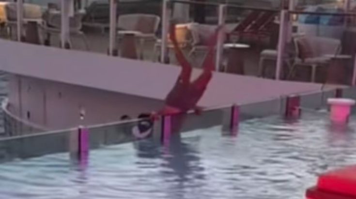 Σε βίντεο που καταγράφηκε εν πλω, ο άνδρας φαίνεται να εκτελεί κατακόρυφο στην πισίνα, πριν χάσει την ισορροπία του, χτυπήσει τα οπίσθιά του και περάσει το διαχωριστικό κιγκλίδωμα, ενώ ακούγονται φωνές τρόμου από παριστάμενους.