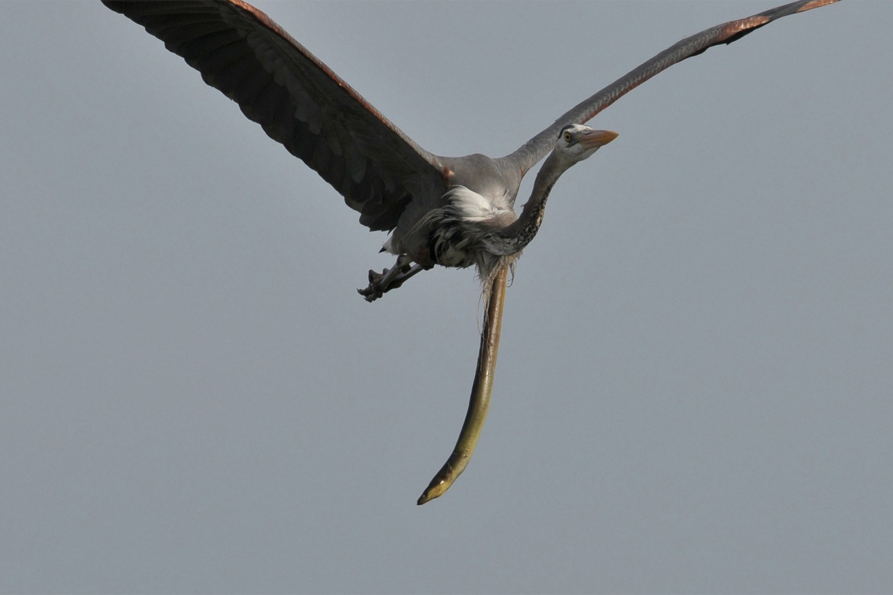 Σαν σκηνή από ταινία τρόμου μοιάζει η στιγμή που ένα χέλι βγαίνει από το στομάχι ενός ερωδιού ενώ το πουλί πετούσε. Τη στιγμή αυτή κατέγραψε ο ερασιτέχνης φωτογράφος Σαμ Ντέιβις στο Ντελάγουερ και οι φωτογραφίες πραγματικά συγκλονίζουν. Στα κλικ του καταγράφεται το χέλι που κρέμεται από το έντερο του ερωδιού και έρχεται προς τα μπροστά.