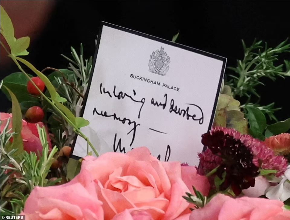 Το μήνυμα στην κάρτα πιστεύεται ότι έγραφε «Με αγάπη και αφοσιωμένη μνήμη. Charles R». Το στεφάνι τοποθετήθηκε στο φέρετρο νωρίτερα σήμερα το πρωί, αφού οι πόρτες στο Westminster Hall είχαν κλείσει για το κοινό.