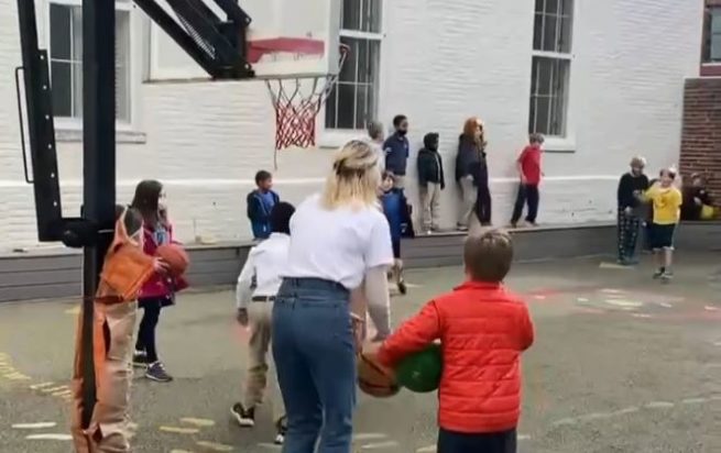 Υποσχέθηκε μάλιστα στους μικρούς μαθητές της, ότι εάν καταφέρει να βάλει καλάθι από την απέναντι μπασκέτα θα τους κεράσει μια ζεστή σοκολάτα.