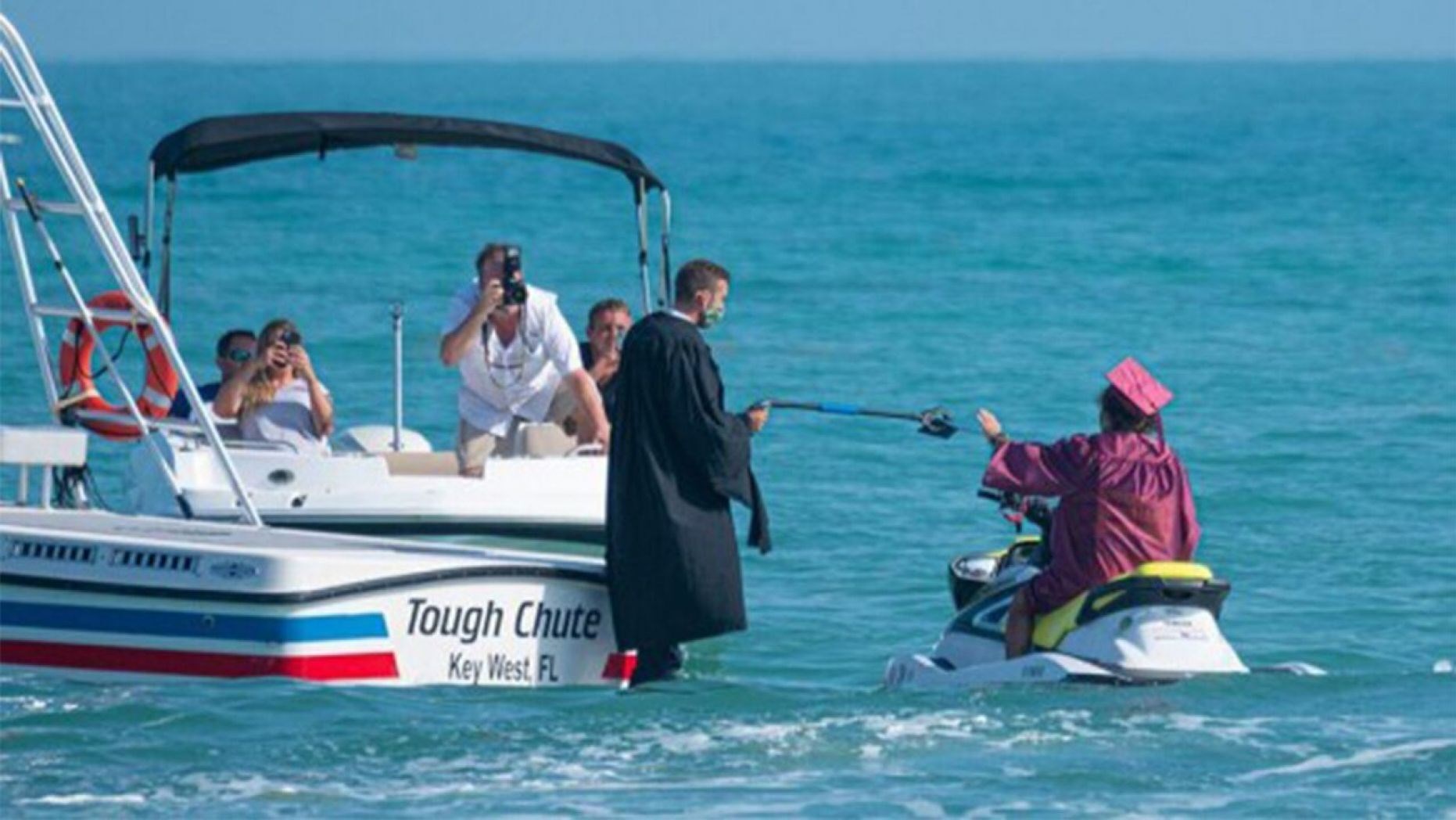 Μια μοναδική αποφοίτηση ετοίμασε το σχολείο στα Key West στην Φλόριντα των ΗΠΑ για τους μαθητές που ολοκλήρωσαν τις σπουδές τους. Οι τελειόφοιτοι του Somerset Island Prep, φόρεσαν τις τηβέννους τους, έβαλαν τις μάσκες τους και ανέβηκαν στα… τζετ σκι τους. Η πρωτότυπη ιδέα ήρθε λόγω των μέτρων προστασίας για τονκορονοϊόκαι καθώς η τελετή αποφοίτησης δεν μπορούσε να γίνει σε αίθουσα του σχολείου.