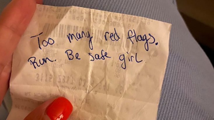 Ένας “καλός Σαμαρείτης” προσπάθησε να σώσει μία γυναίκα από ένα ραντεβού όπου ο συνοδός της έμοιαζε να είναι εντελώς λάθος για εκείνη. Κάποια στιγμή που εκείνος ήταν στην τουαλέτα, ο άνδρας πίσω της, της έδωσε ένα μήνυμα γραμμένο σε απόδειξη προτρέποντάς τη να τρέξει μακριά για να είναι ασφαλής γιατί είδε πολλές “κόκκινες σημαίες”.