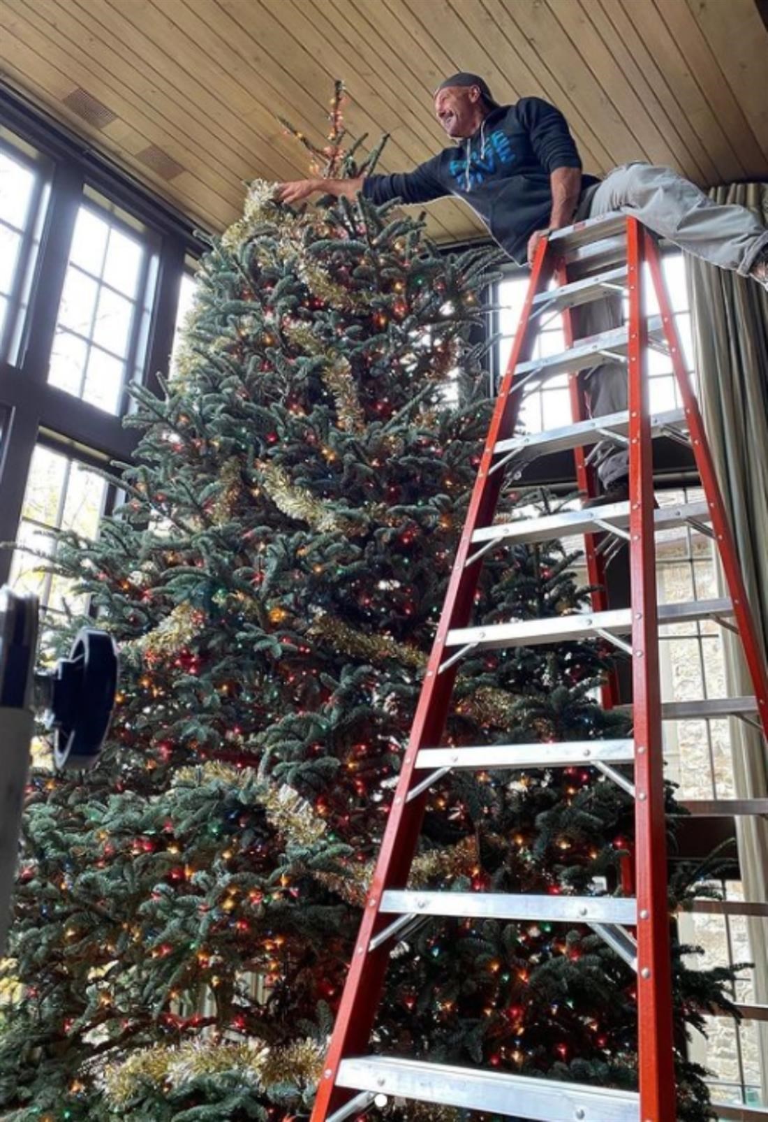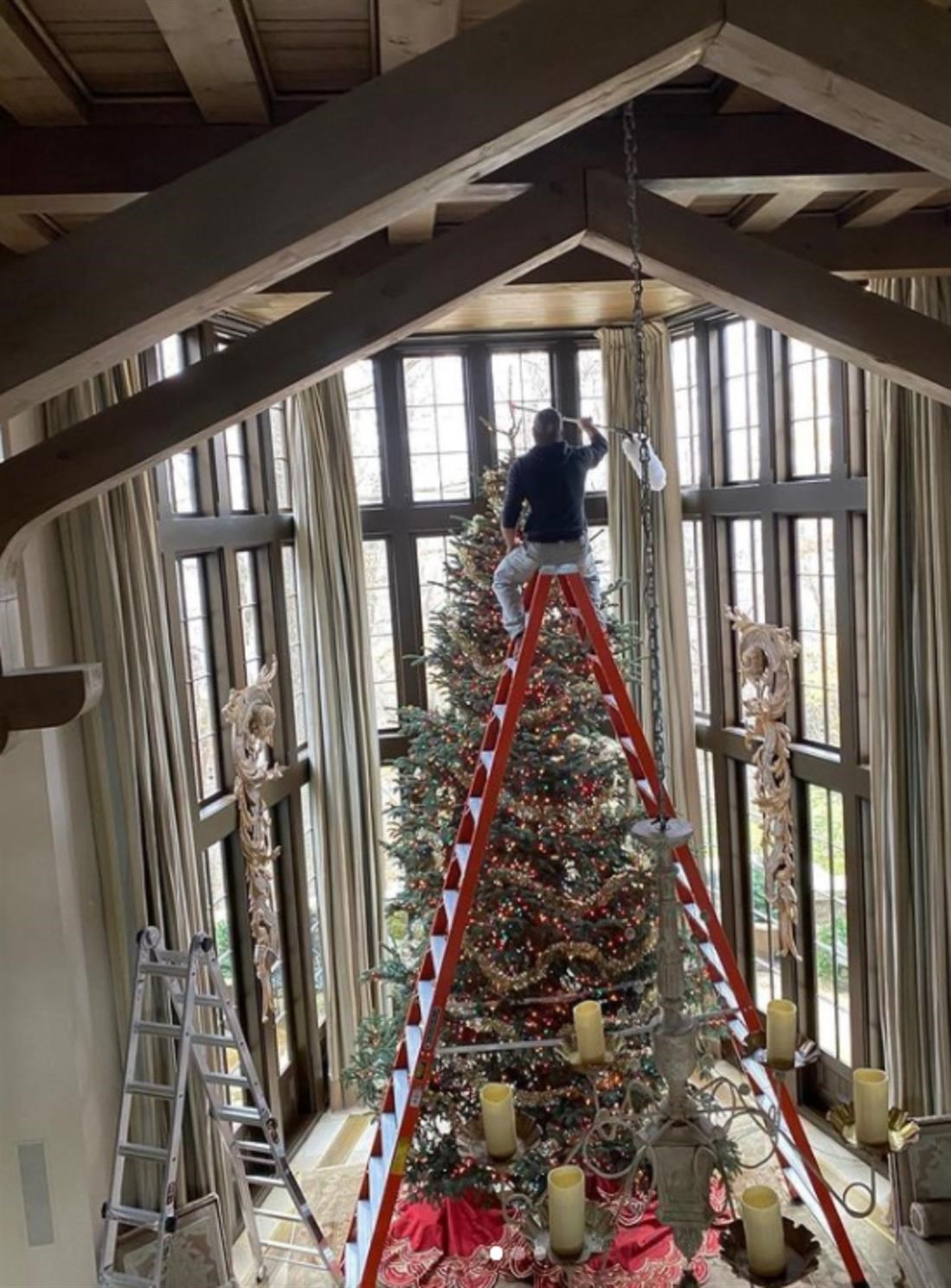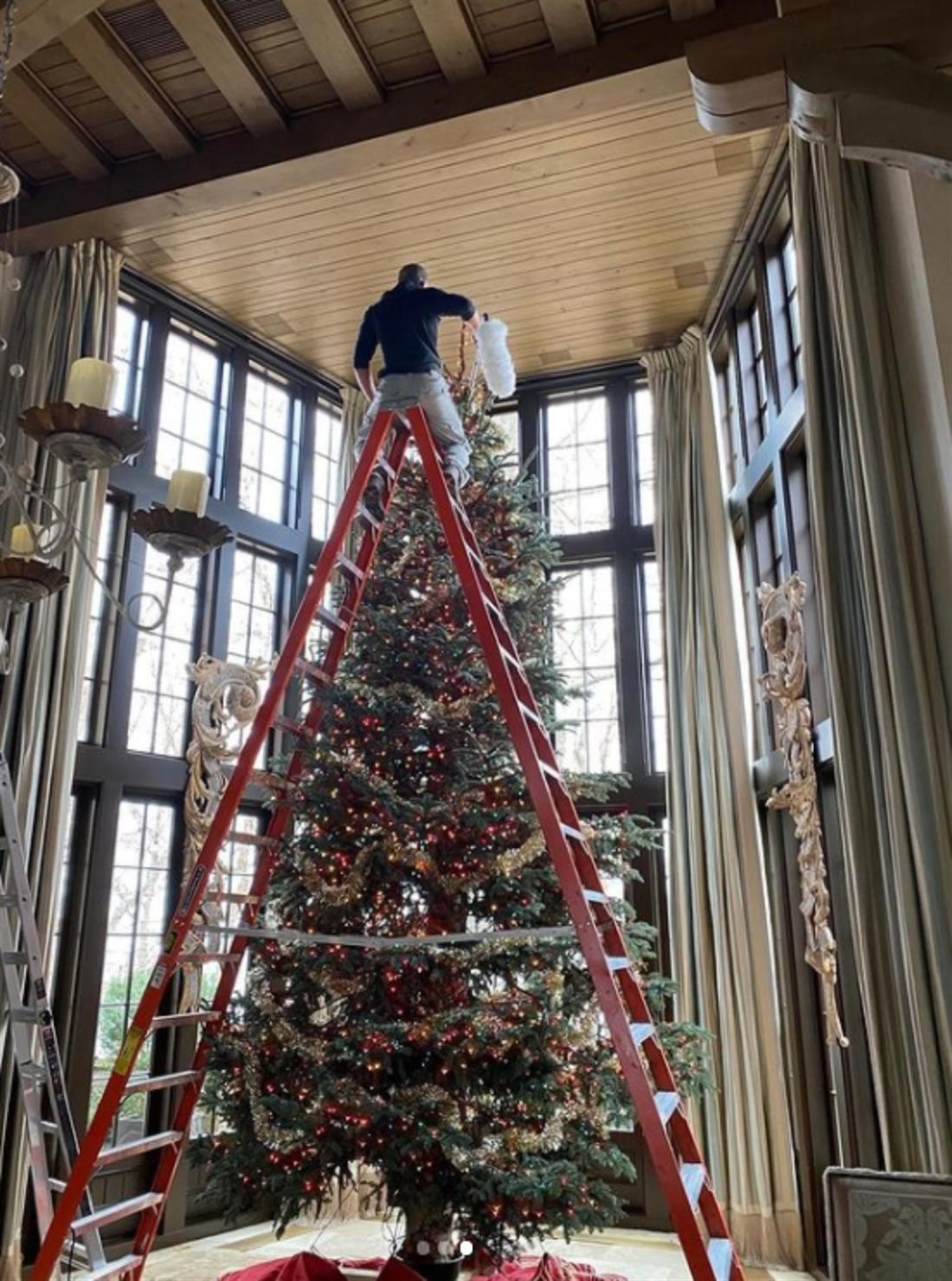 Για να στολιστούν τα πάνω κλαδιά του δέντρου, το οποίο είναι ύψους έξι μέτρων, απαιτείται η χρήση σκάλας. Στις φωτογραφίες, ο τραγουδιστής-τραγουδοποιός βρίσκεται στην κορυφή της σκάλας δίπλα στο χριστουγεννιάτικο δέντρο.