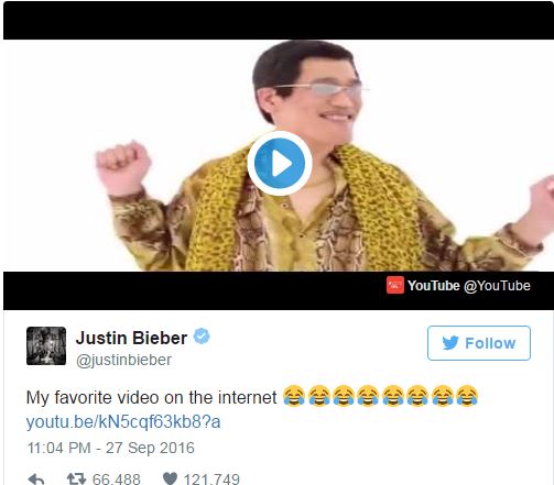 Όταν ο νεαρός καλλιτέχνης τουίταρε στους 89 εκατ. ακόλουθούς του πως πρόκειται για το αγαπημένο του βίντεο στο ίντερνετ, αμέσως δέχτηκε 65.000 retweets και 120.000 likes, γεγονός που έκανε τον Πίκο Τάρο να ευχαριστήσει τον Μπίμπερ γι΄αυτό.
