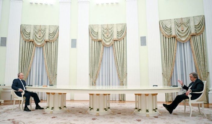 Putin meets UN secretary general António Guterres in the Kremlin. The long table is back! pic.twitter.com/zjVkHRFL5v