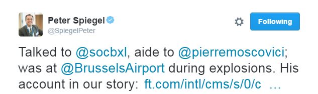 Ένας βοηθός του Επιτρόπου Οικονομικών της Ευρωπαϊκής Ένωσης, Πιέρ Μοσκοβισί, ο Simon O’Connor, βρισκόταν στο αεροδρόμιο των Βρυξελλών την ώρα των δύο ισχυρών εκρήξεων, όπως αναφέρει ο δημοσιογράφος Πίτερ Σπίγκελ.