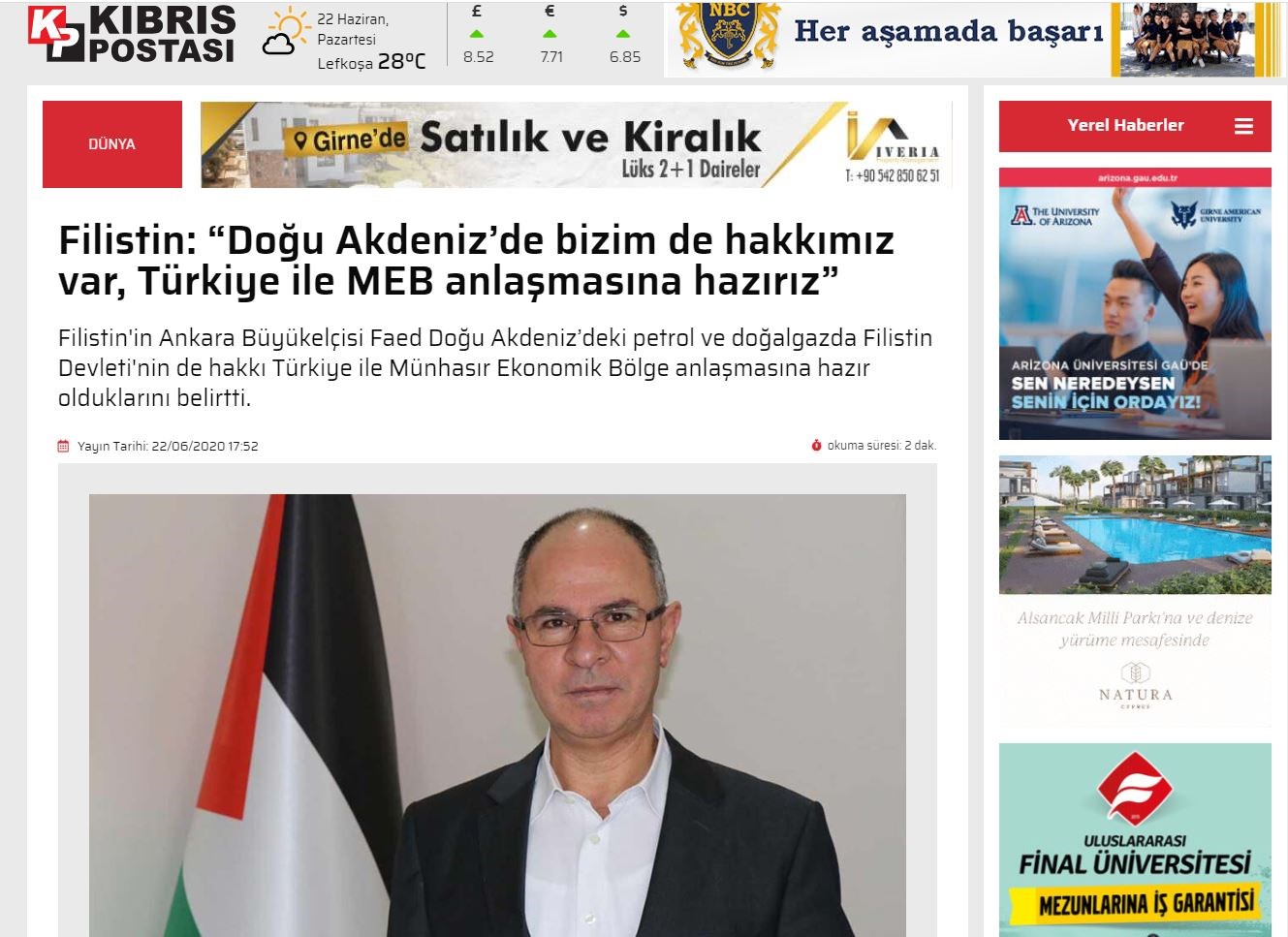 Σε δήλωση-βόμβα προχώρησε τη Δευτέρα ο Παλαιστίνιος πρέσβης στην Άγκυρα, Φαέντ Μουσταφά ο οποίος στάθηκε στους στενούς δεσμούς της χώρας του με την Τουρκία, επισήμανε πως “είμαστε ανοιχτοί σε όλες τις ιδέες για την ανάπτυξη αυτών των σχέσεων. Αυτό ισχύει και για το θέμα της συμφωνίας ΑΟΖ με την Τουρκία. Έχουμε και εμείς δικαιώματα στη Μεσόγειο. Έχει και η Παλαιστίνη μερίδιο στο πετρέλαιο και στο φυσικό αέριο στην Ανατολική Μεσόγειο”.